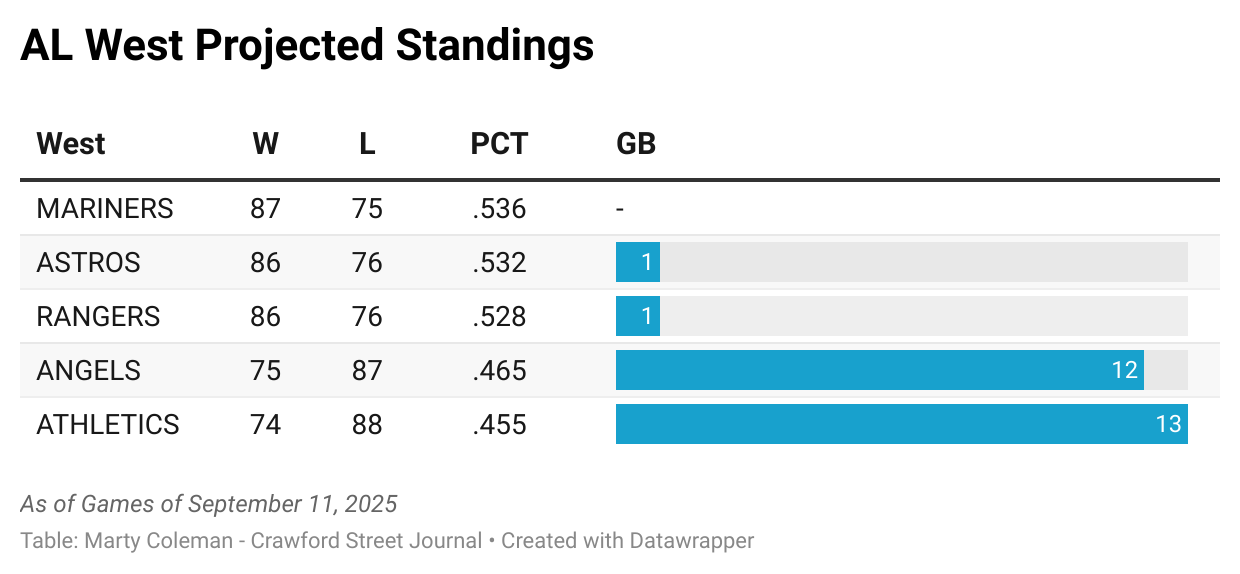 Fangraphs projects the Astros and Mariners to 87 wins with Seattle a few percentage points ahead and the Rangers finishing with 84 wins.