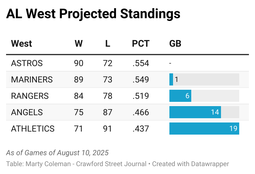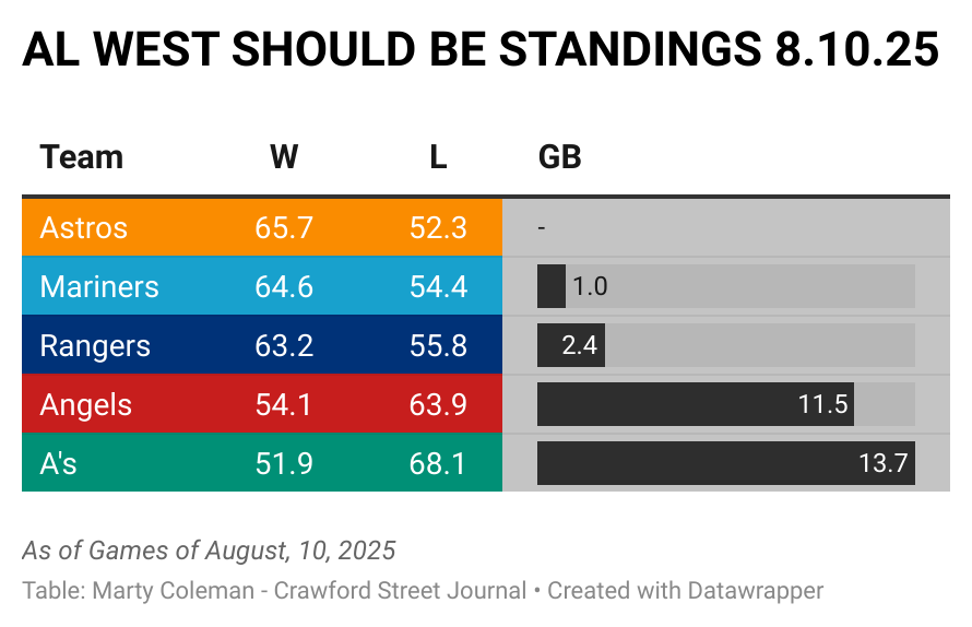 If the wins and losses and run differential continue at the current rate, we would expect the final AL West Standings to look like this: