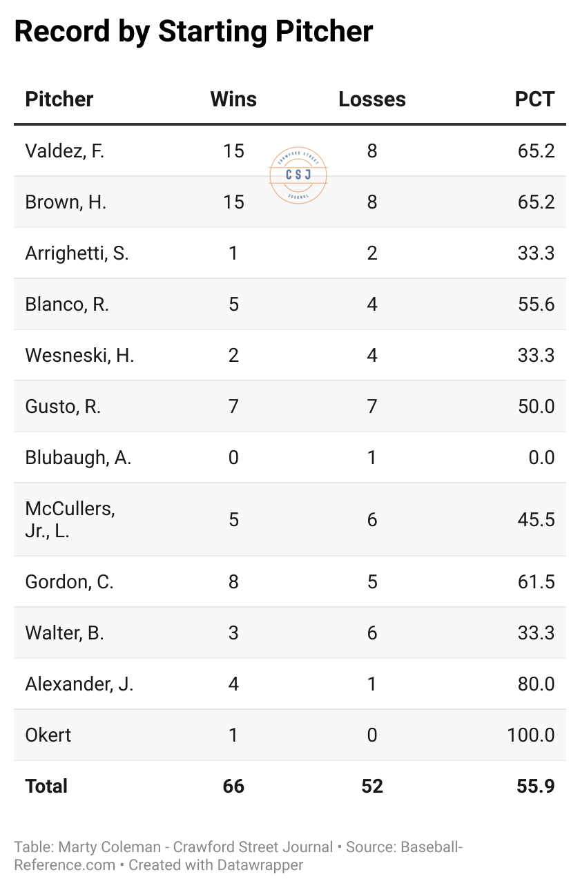 The Astros are 12-6 in games started by Colton Gordon and Jason Alexander.