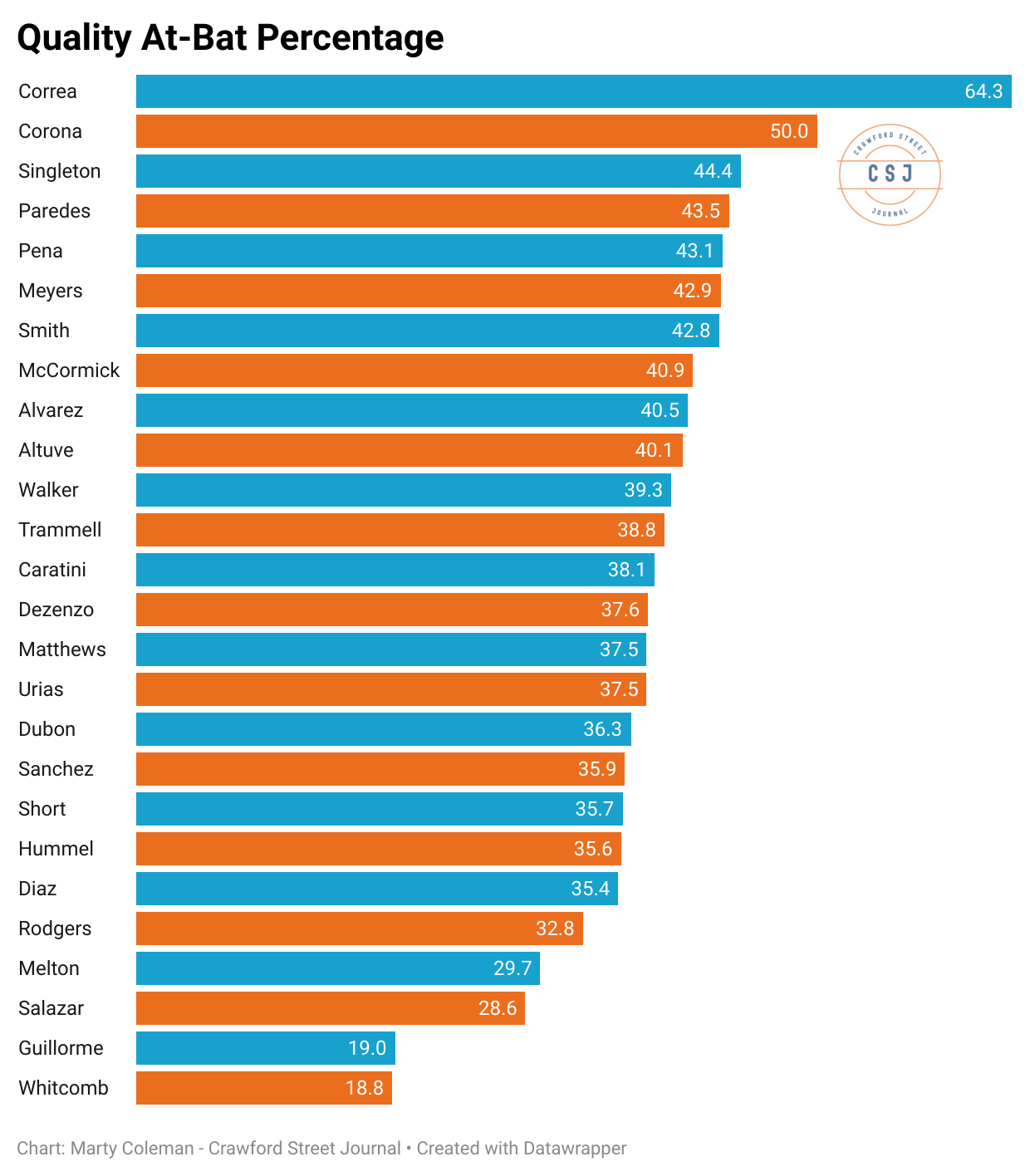 Correa continues to rake and Altuve hits the 40% mark for the first time that I can remember with a 4 for 5 (quality at-bats) day on Sunday.