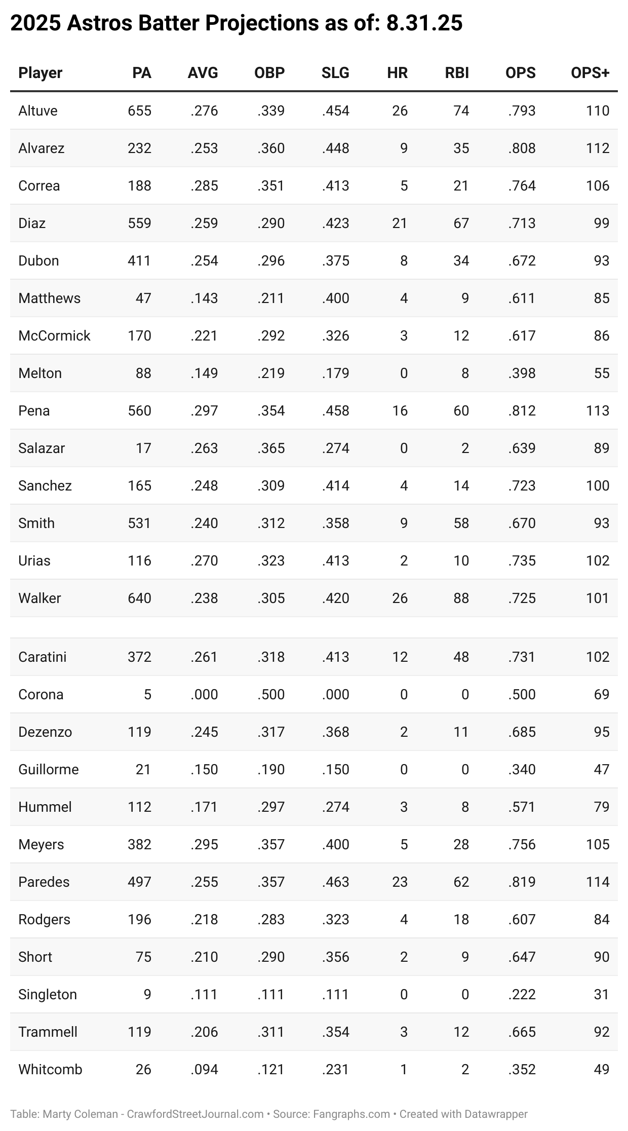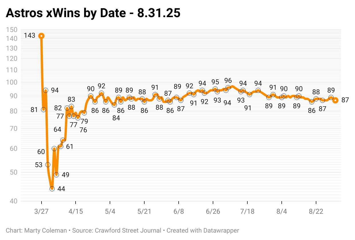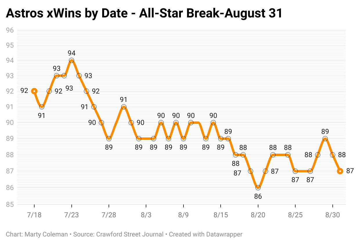 The Astros finished July with 91 expected wins (by my calculation) and finished it with 87 and while there is plenty of blame to go around, the offense is the obvious answer as to culprit No. 1.