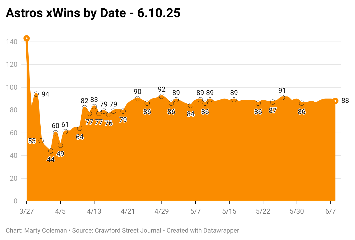 Currently, the Astros are 0.29 games to the positive, meaning they have benefited from a pinch of luck, likely due to a 10-7 record in one-run games and a 3-0 record in extras.