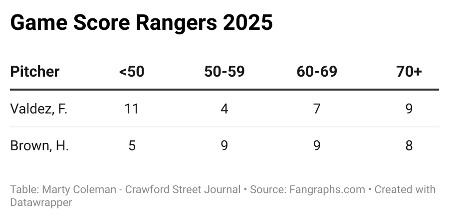 In over one-third of his starts, Valdez was below average, while Brown was below average in only 16% of his.
