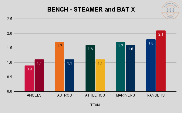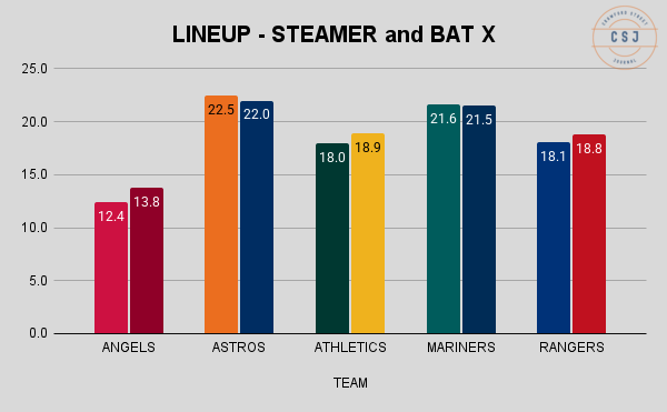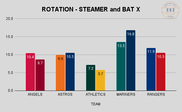 Each of those is lower than the projections below, except for the Angels (both projections) and the Mariners BAT X projection.