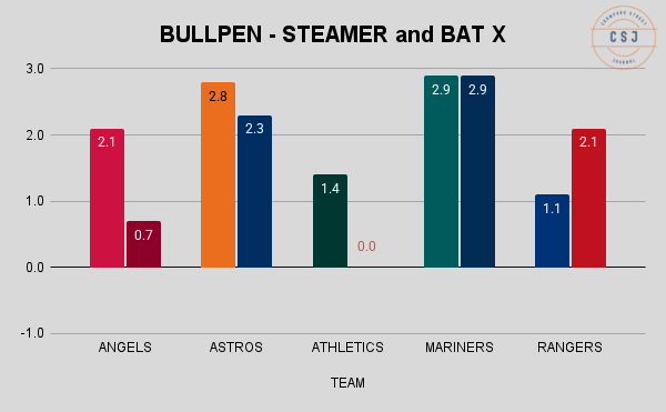 For reference, here are the 2026 fWAR numbers: Angels 13.3, Astros 38.8, Athletics 29.4, Mariners 42.5, Rangers 34.2.