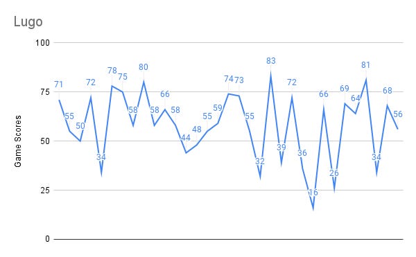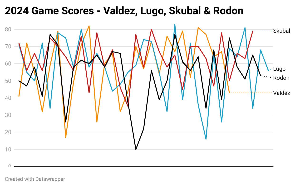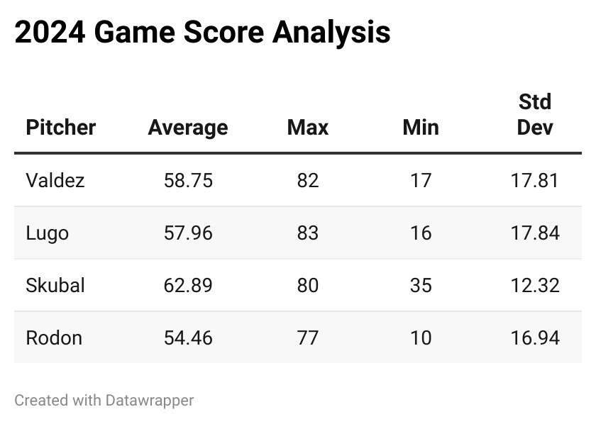 This led me to chart every Game Score for some American League pitchers with the most wins in 2024: Framber, Seth Lugo, Tarik Skubal and Carlos Rodon.