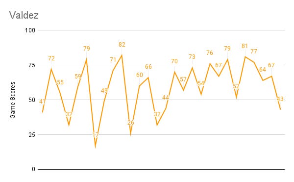 Valdez also has the second-highest max, and second-highest min (though it’s not close).