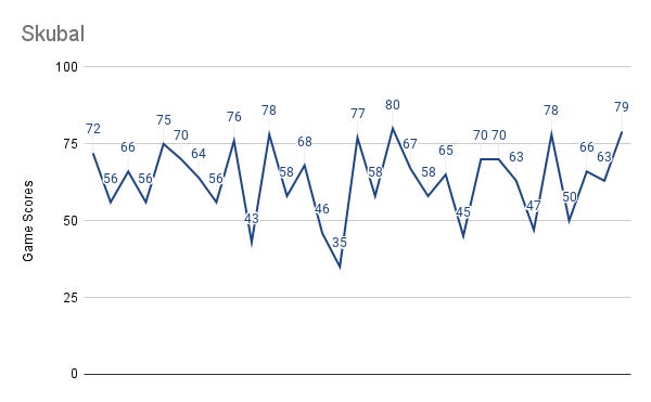 Skubal had very few outliers. Most are between mid-70s and high 50s.