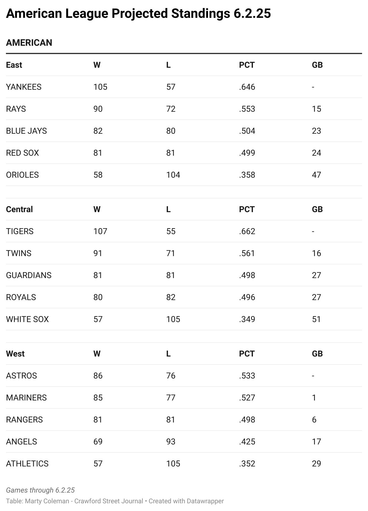 MLB Projected StandingsProjected Standings - June 3, 2025The best team through the first third of the season is...Marty ColemanJun 03, 202511ShareThe Detroit Tigers.Followed by the Yankees, Cubs and Mets.SubscribeShareLeave a commentPreviousNext