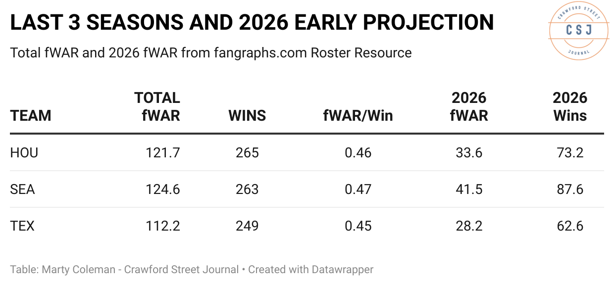 Over the last three seasons, the Astros have averaged 0.46 fWAR per win, and with 33.6 fWAR currently on the projected roster that comes out to an estimated 73.2 wins, 14.4 wins behind the Mariners projection.
