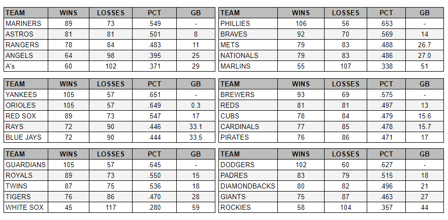 On a scale where 100.00 = 81 wins. In other words, a power number of 110.00 means you would be expected to win 110% of the “average team” (81 wins) which equals 89 games.