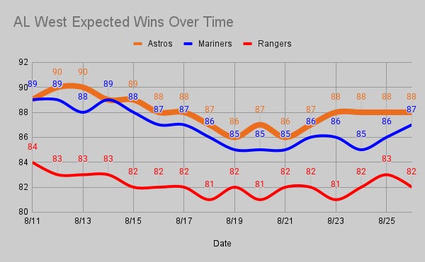 Over on the playoff odds page, the site assigns the Astros 88.6 wins and the Mariners 88.0.