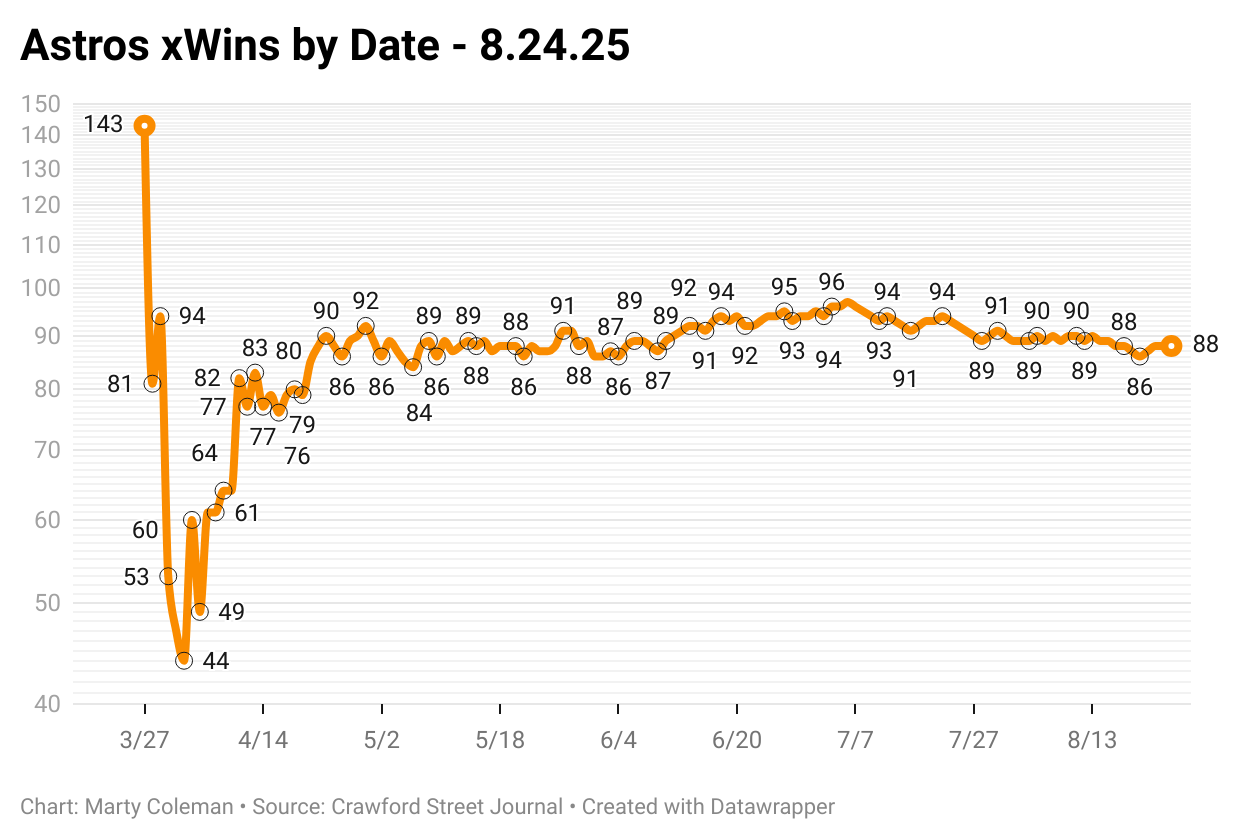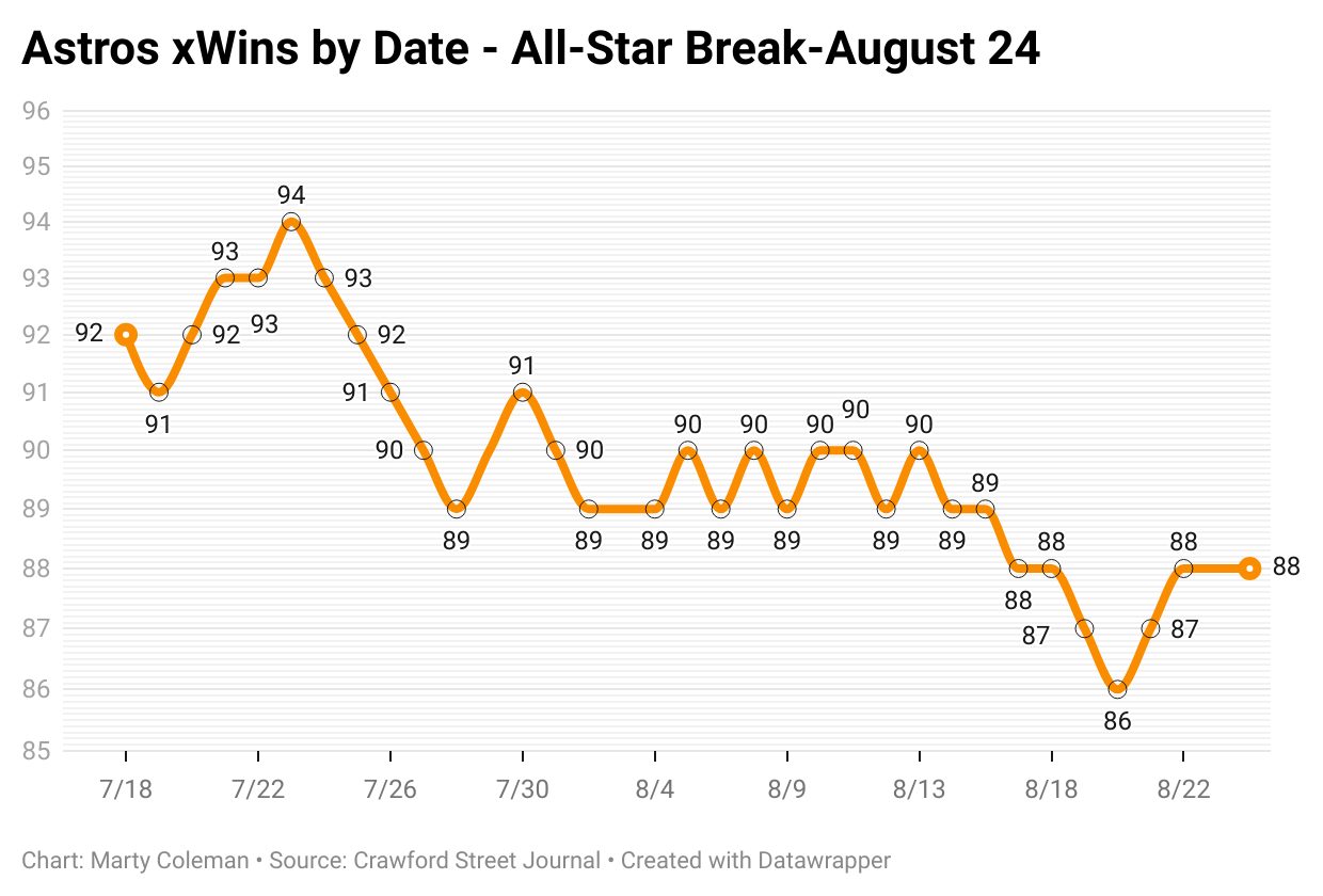 The expected wins since the All-Star Break view gives a clearer picture than the season-long chart, and it shows the Astros have lost 4 expected wins since the break.