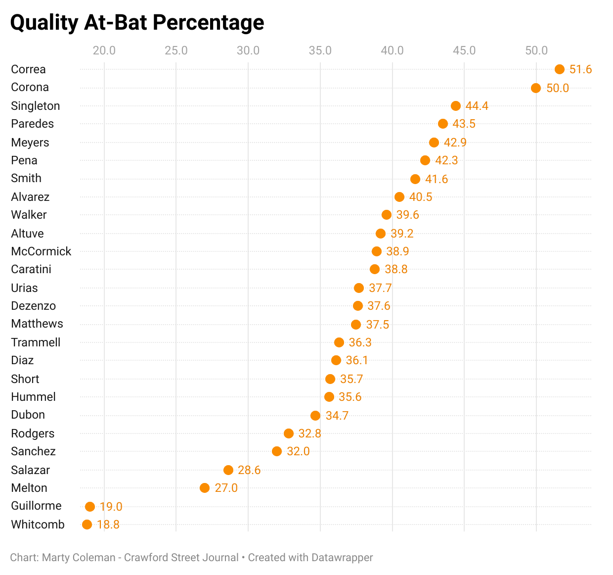 Carlos Correa has been incredible since his return, slashing 349/.407/.494 with a .393 wOBA and 155 wRC+ over 91 plate appearances and playing a sterling third base with 1 OAA.
