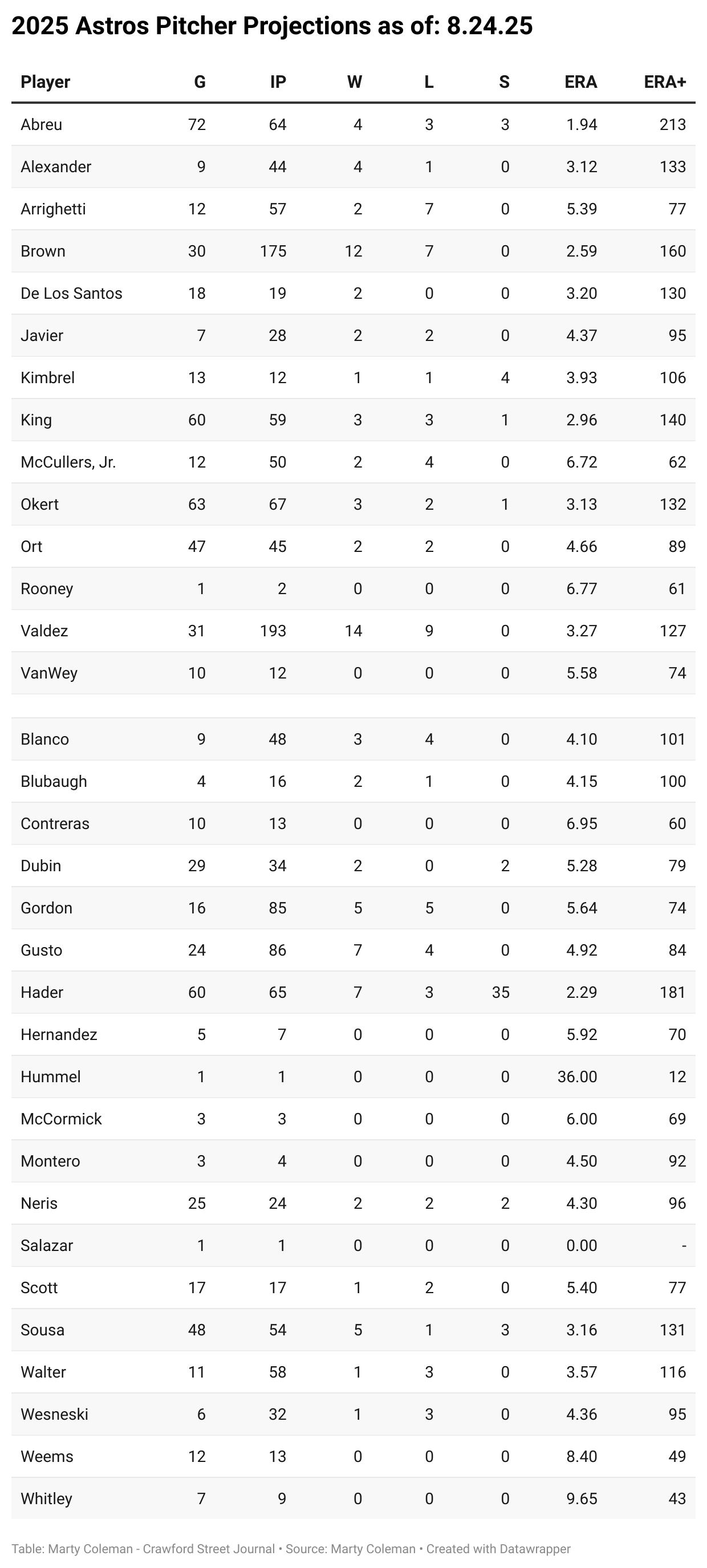Hunter Brown and Jason Alexander lead the rotation in August with ERAs of 1.44 and 1.54, respectively, while Spencer Arrighetti (6.52) and Framber Valdez (7.33) have struggled.