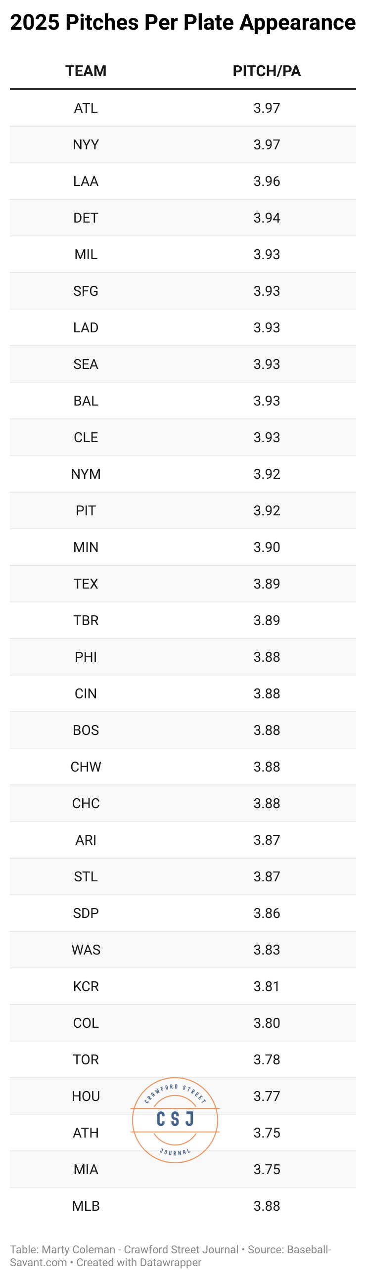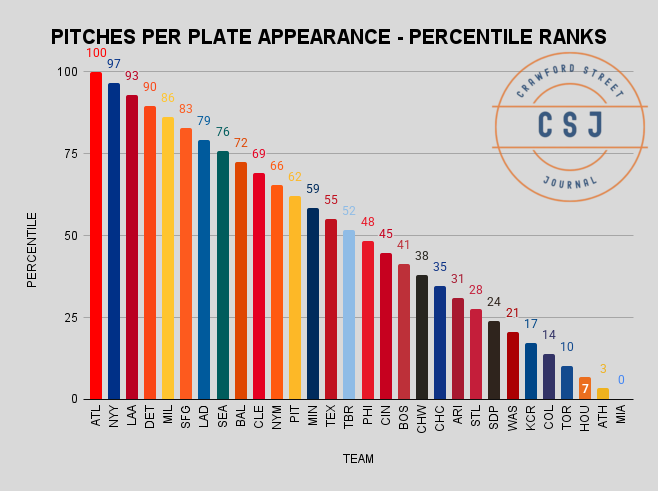 But put into the context of percentiles, much like Baseball Savant uses, the Astros show up in the 7th percentile in pitches seen per plate appearance.