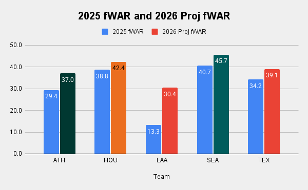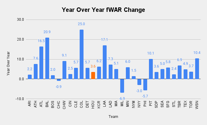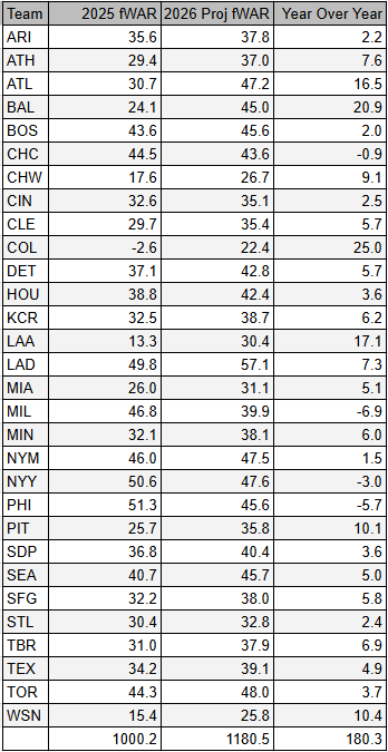 So here we're kind of mixing backwards-looking value assessments (last year's WAR) with forward-looking talent projections (preseason forecasts), which have two distinct purposes.